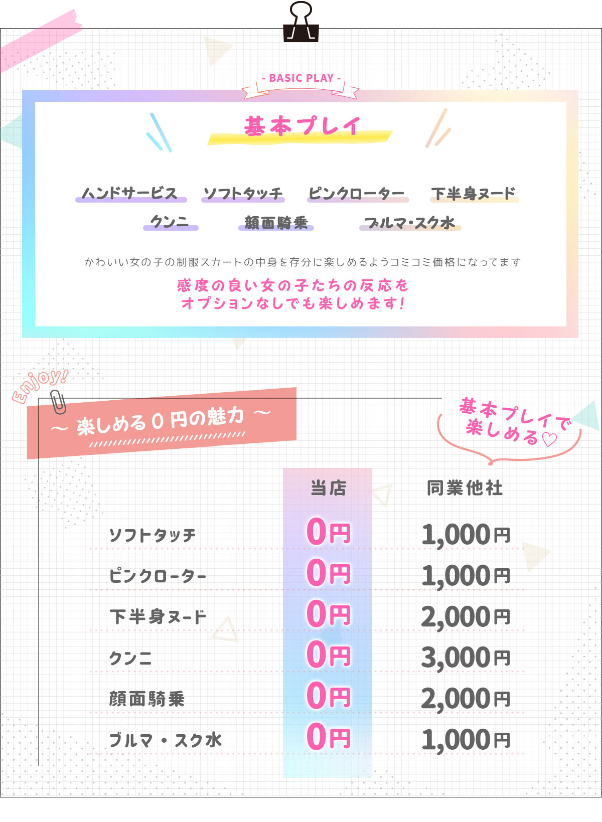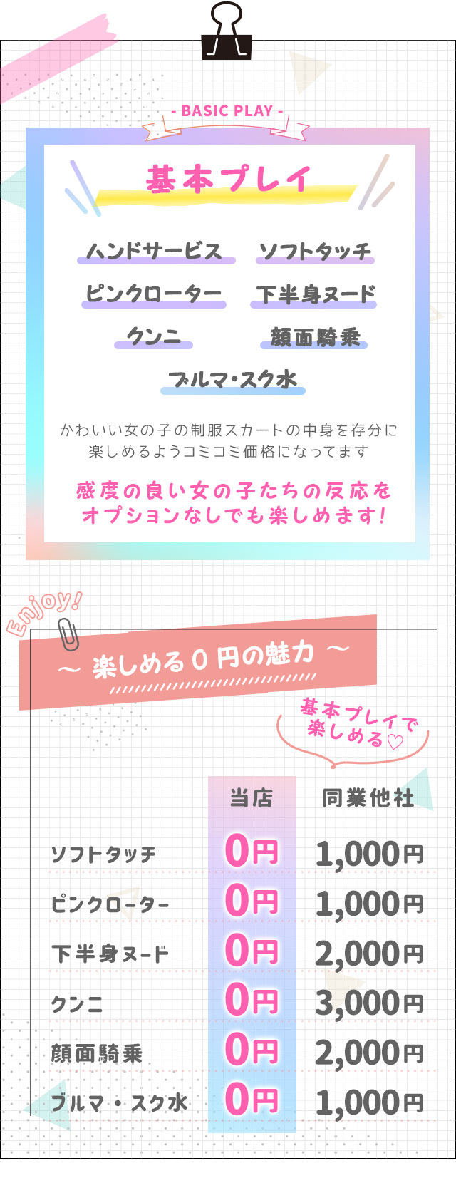 その他、当店が不適切と判断した方 上記の禁止事項をご了解頂けず、以上の行為に及んだ場合はサービスを中断させて頂きます。また、その際のサービス料金の返金は一切致しません。ルールをお守り頂き、健全なプレイをお楽しみください。